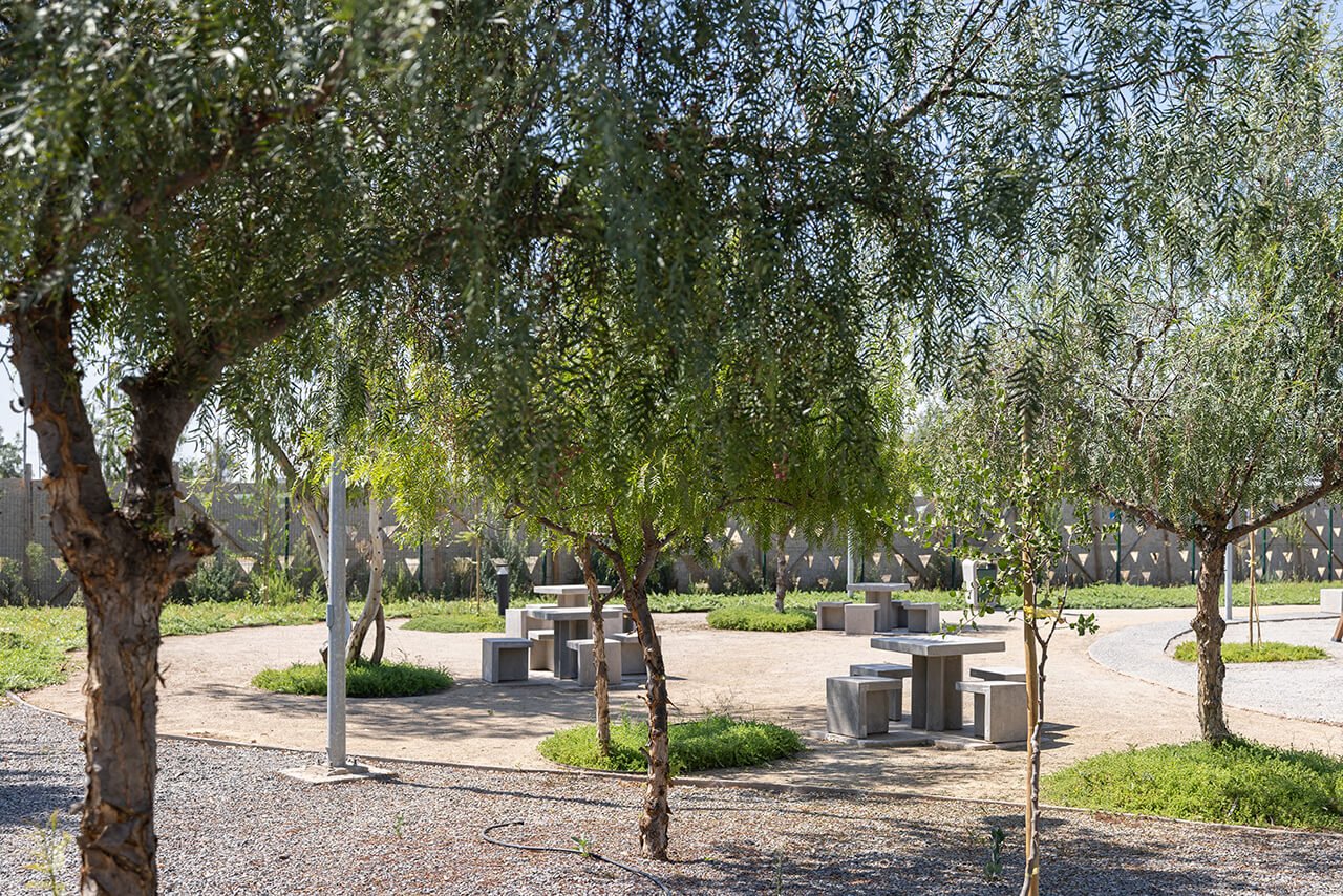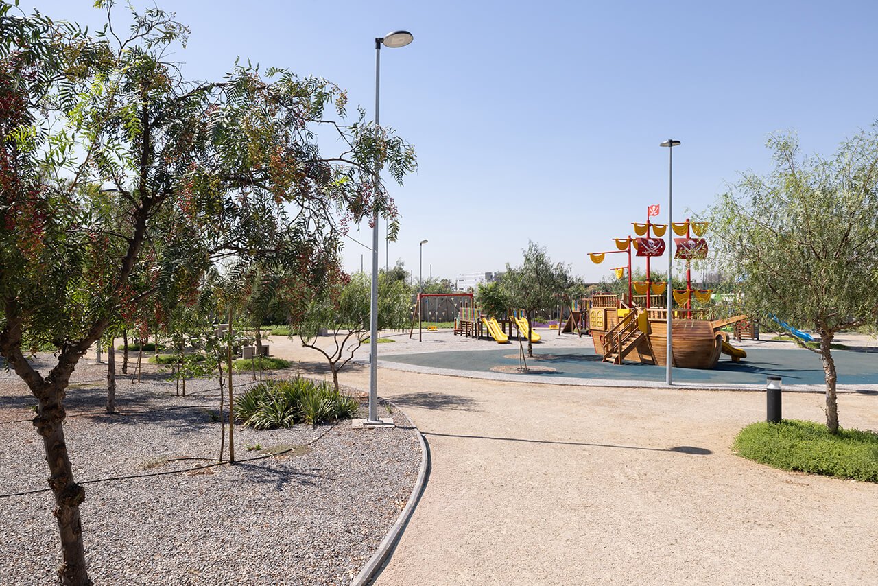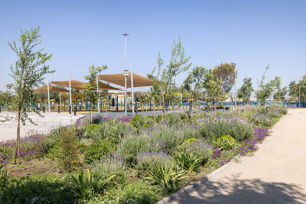 El parque ofrece zonas de juegos infantiles, caniles, circuitos de caminata, espacios de dispersión, graderías y toldos para feriantes, todo dispuesto de manera estratégica para fomentar el uso transversal del espacio por parte de vecinos y visitantes. La propuesta paisajística considera una selección de árboles, arbustos y cubresuelos acompañados de un sistema de riego eficiente, lo que asegura un entorno verde sostenible a lo largo del tiempo.