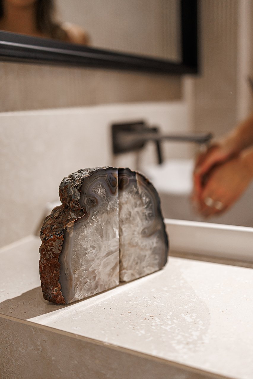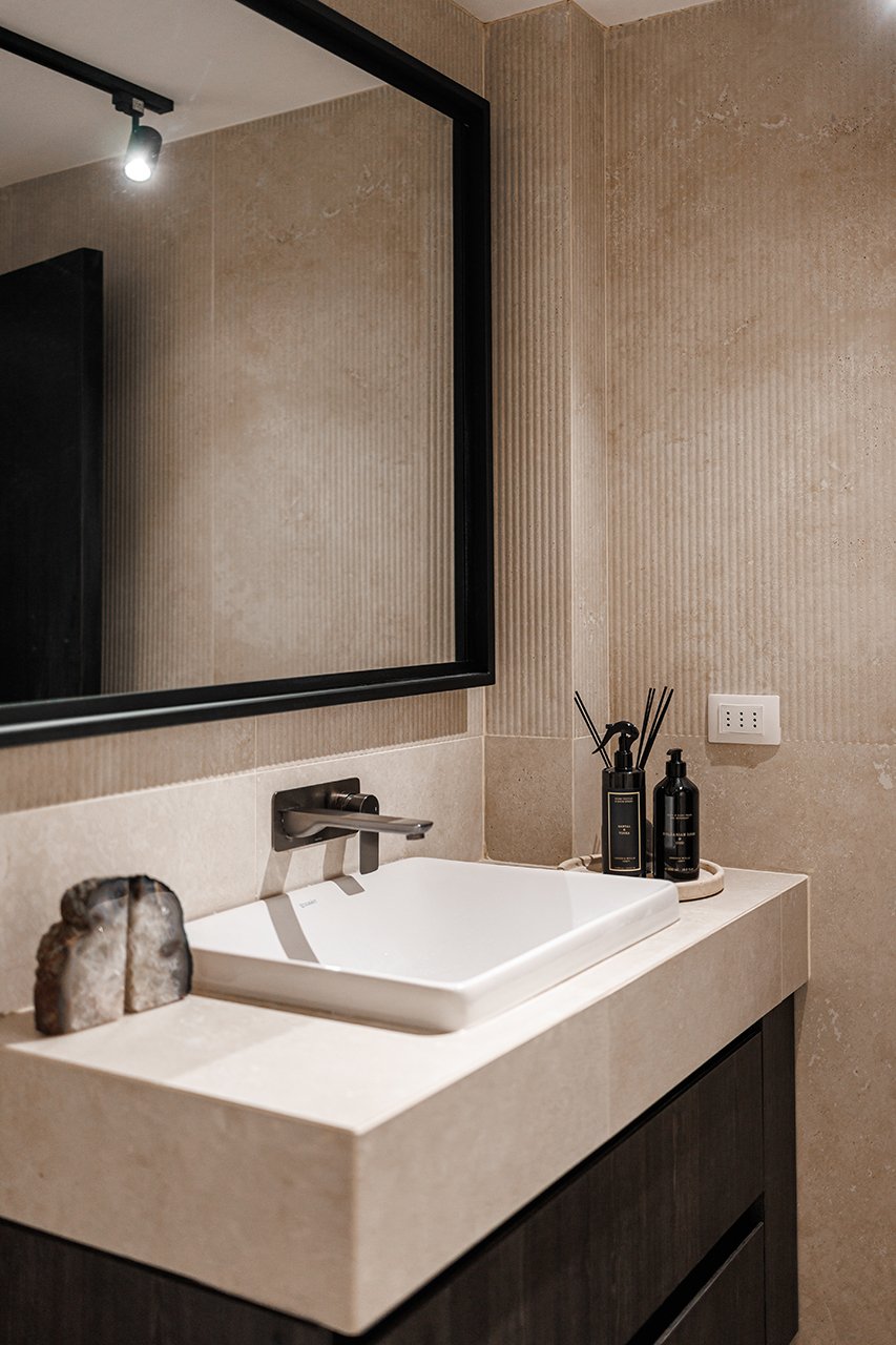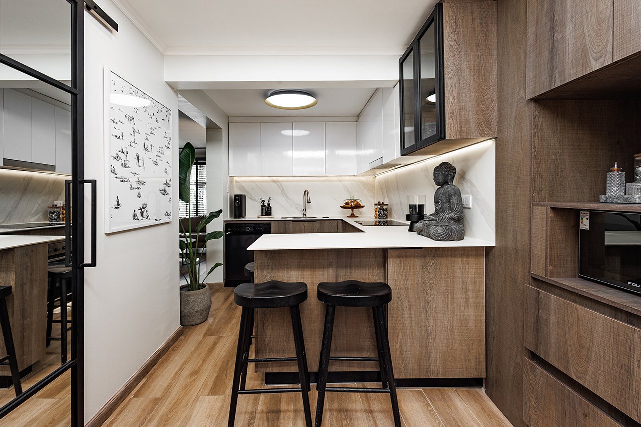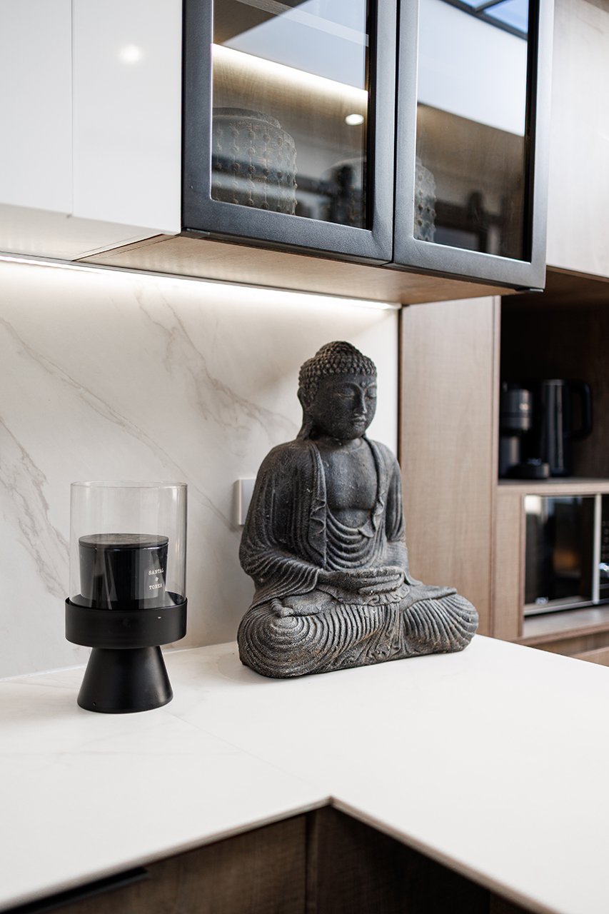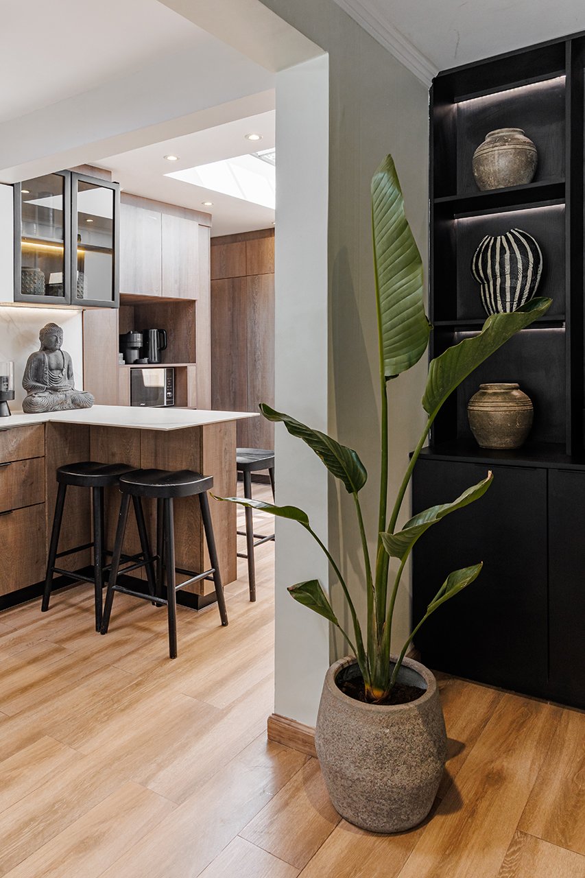 Con guiños a la estética indonesia, las piezas de arte, las tonalidades tierra y la sobriedad cromática hacen que este ambiente trascienda lo puramente utilitario. La cocina deja de ser solo un espacio de preparación para convertirse en un lugar de encuentro, contemplación y disfrute.