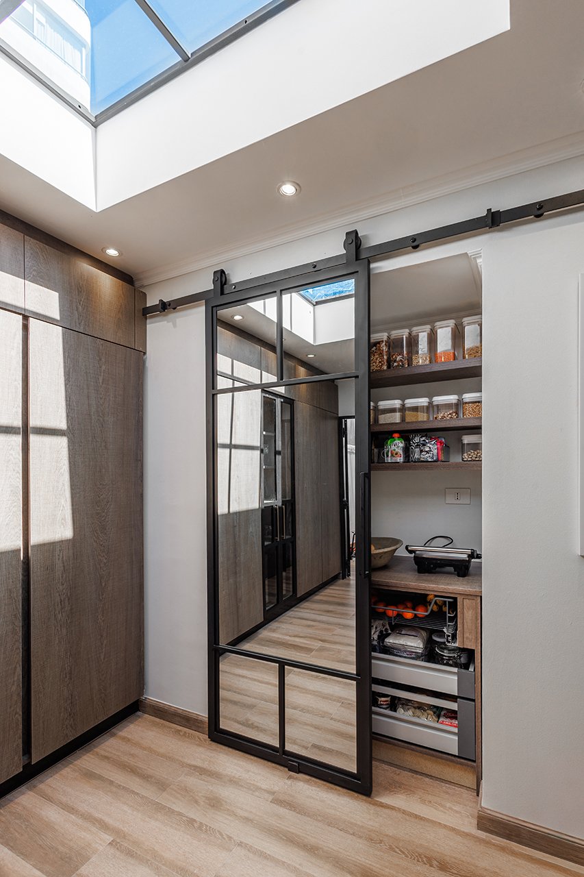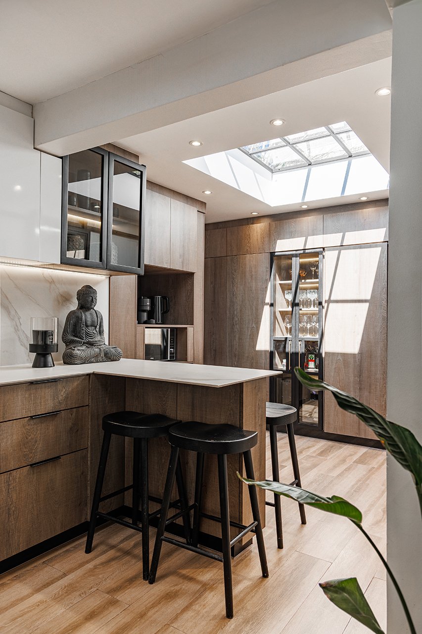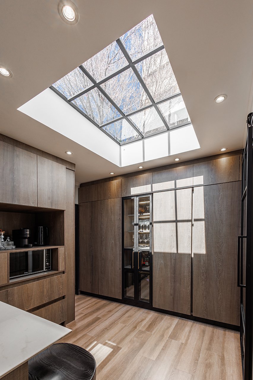 La ampliación de esta cocina abre paso a un espacio luminoso y sofisticado. La lucarna central inunda de claridad las superficies amaderadas, revelando rincones pensados para el bar, la cafetería y el guardado, tres sectores que elevan la experiencia cotidiana al nivel de un espacio social.
