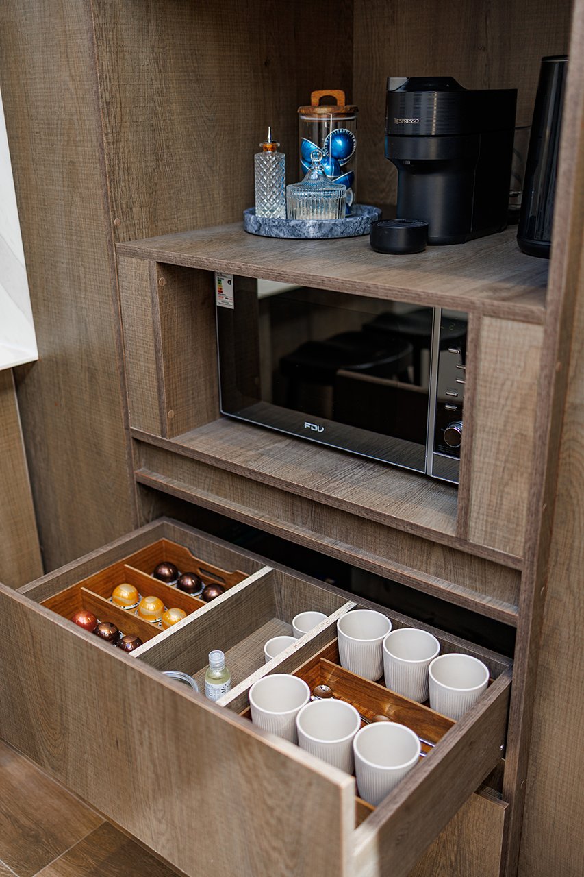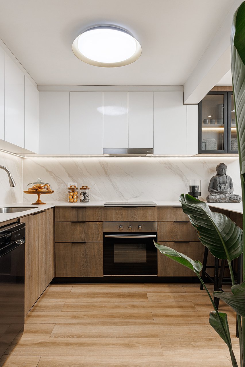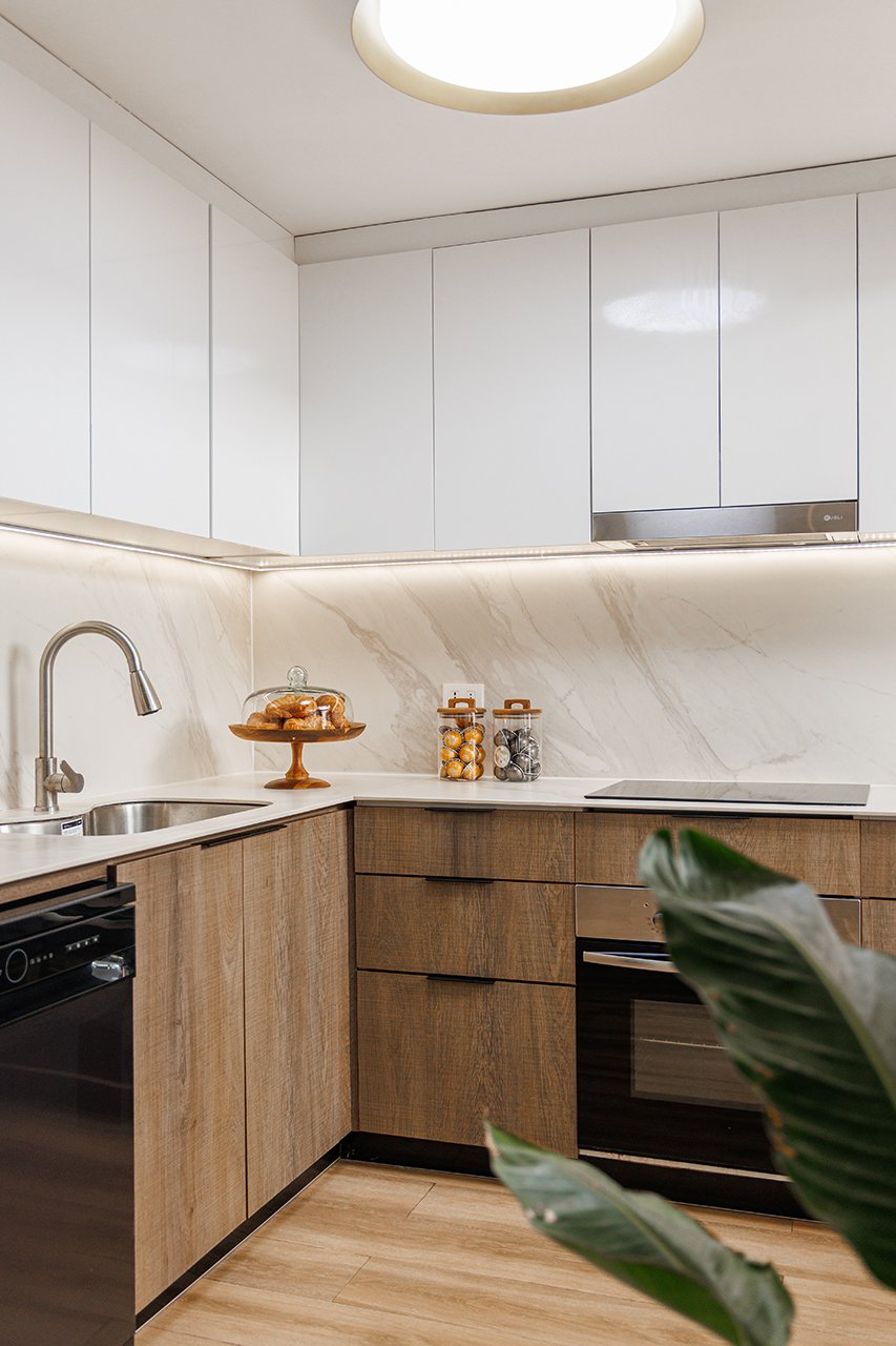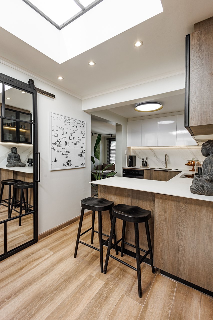 La ampliación de esta cocina abre paso a un espacio luminoso y sofisticado. La lucarna central inunda de claridad las superficies amaderadas, revelando rincones pensados para el bar, la cafetería y el guardado, tres sectores que elevan la experiencia cotidiana al nivel de un espacio social.