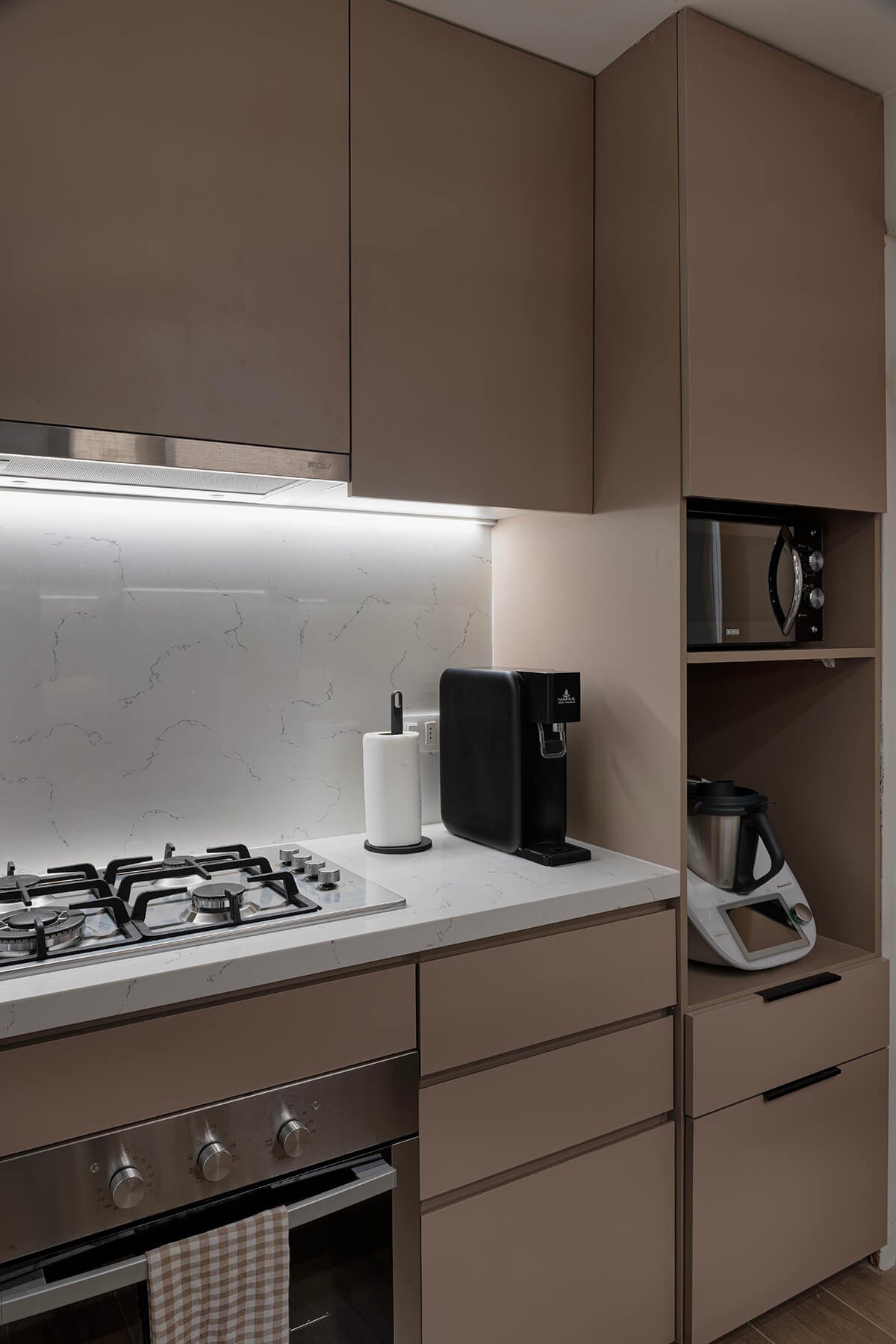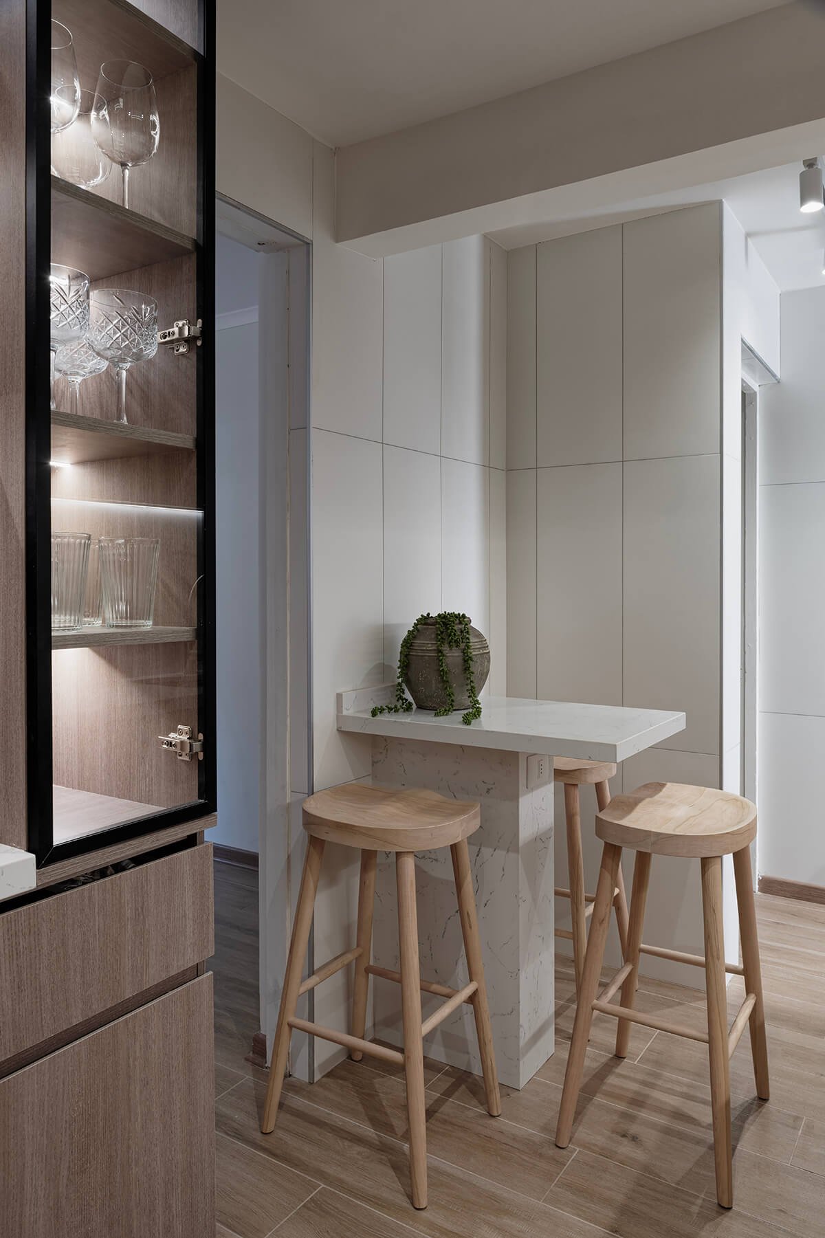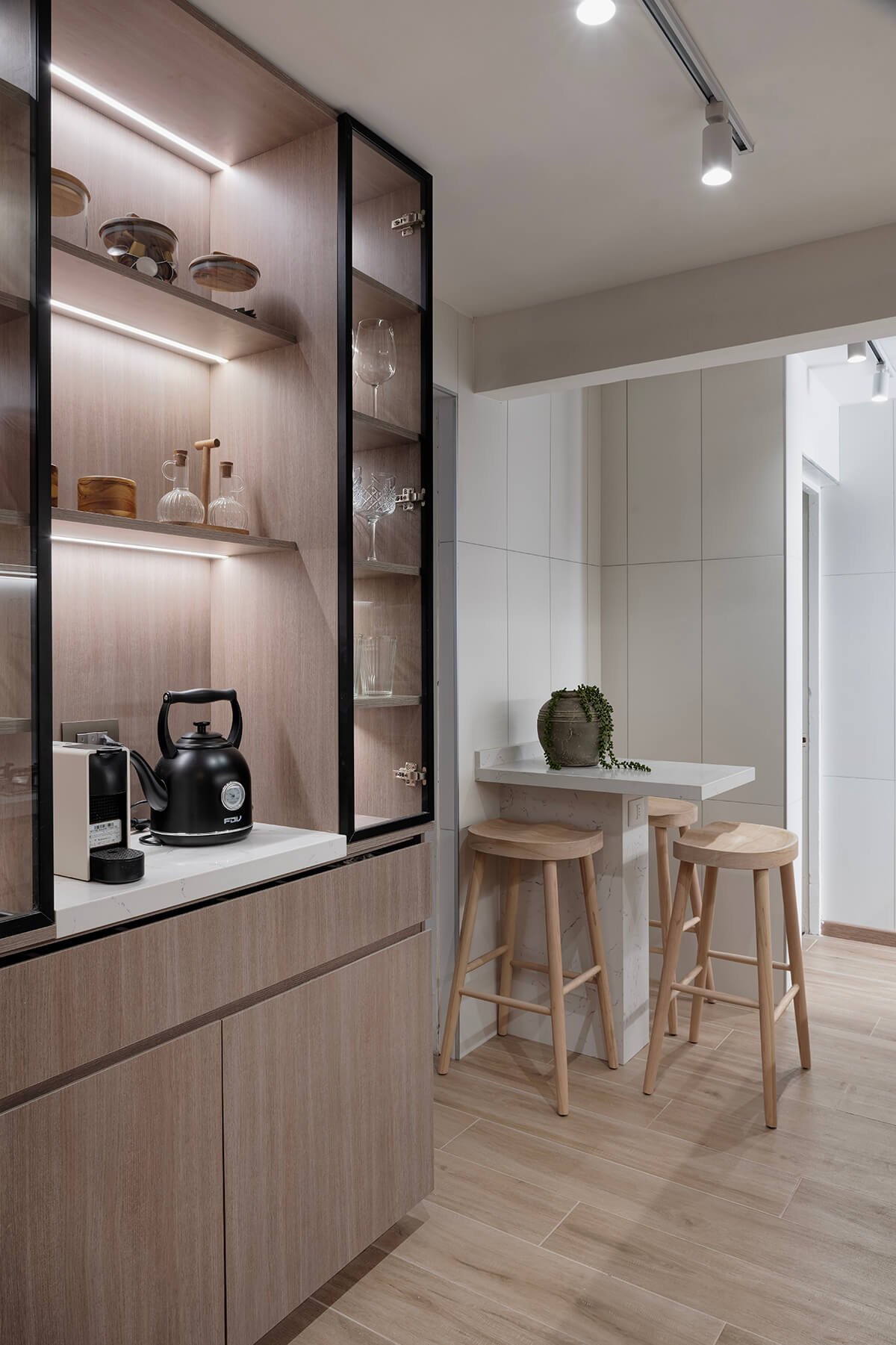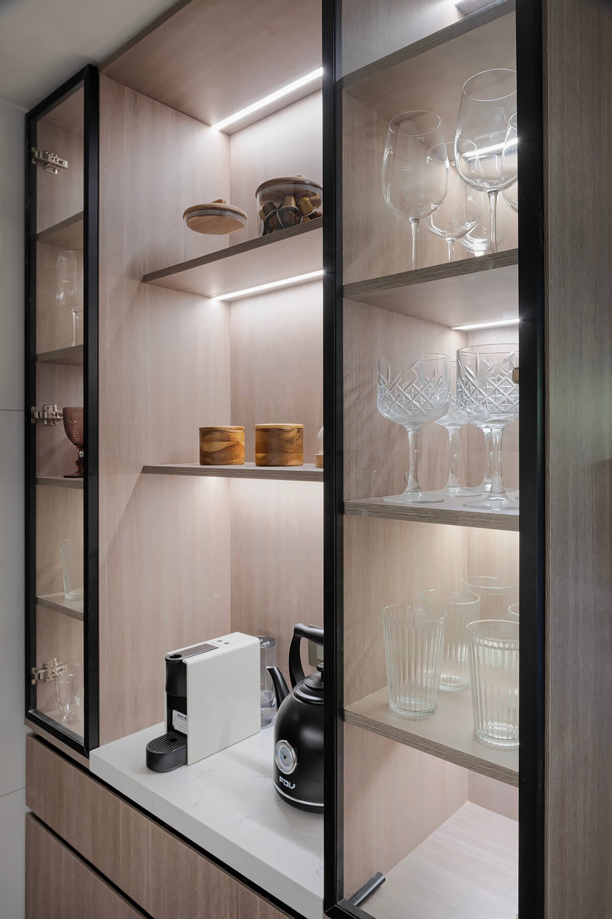 El mueble cafetero se convirtió en el protagonista del espacio, reflejando la dinámica familiar más valorada: el ritual diario del café. Este elemento no solo organiza, sino que personaliza el diseño, adaptándose a las necesidades específicas de la rutina familiar.