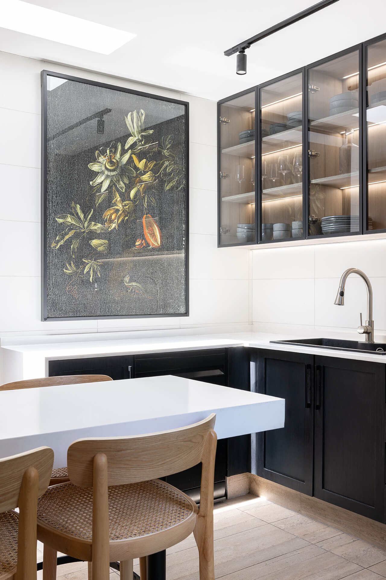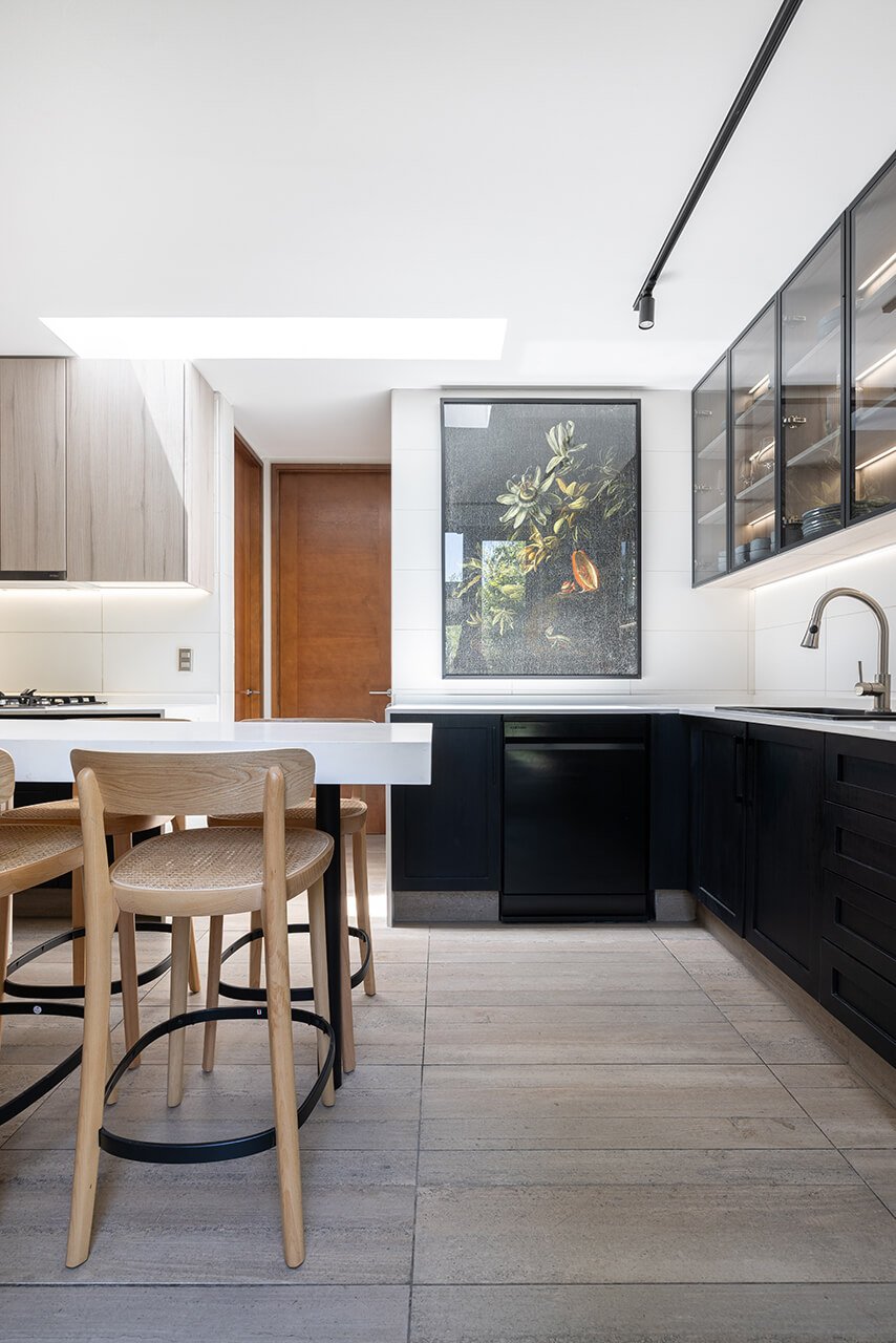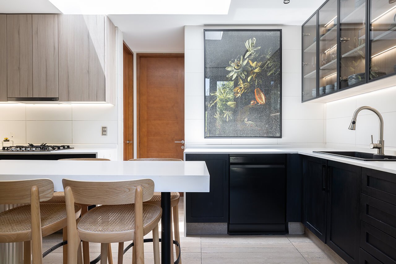 Y como en todo espacio con personalidad, el arte también tiene su lugar. Incluir un cuadro en la cocina transforma el ambiente: rompe con la idea tradicional de “zona de trabajo” y lo convierte en un espacio de recreación, donde cocinar también puede ser una experiencia creativa y visual.