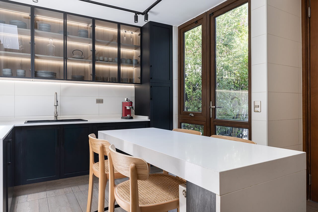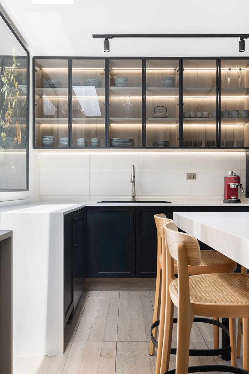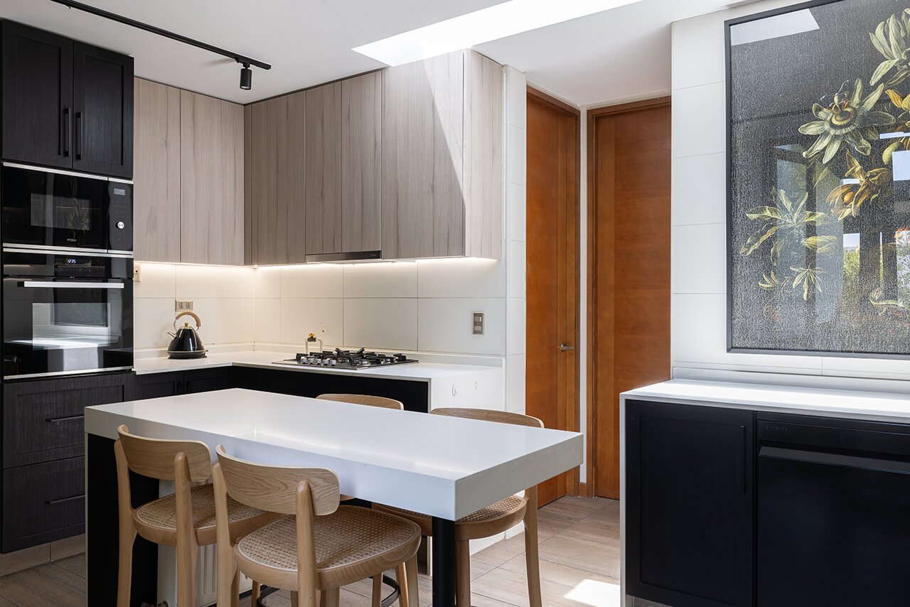 Negro mate como base, detalles sobrios, y una mezcla perfecta entre lo clásico y lo moderno. El resultado: un espacio elegante, con carácter, pero sin perder calidez. Cada línea, cada textura, cada elección está pensada para que esta cocina no pase desapercibida.