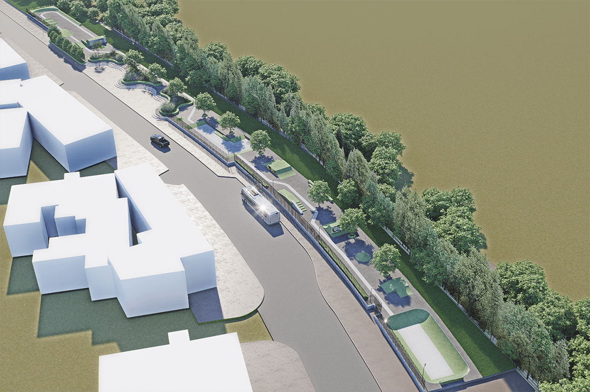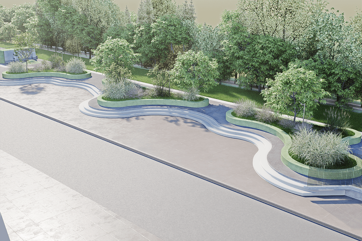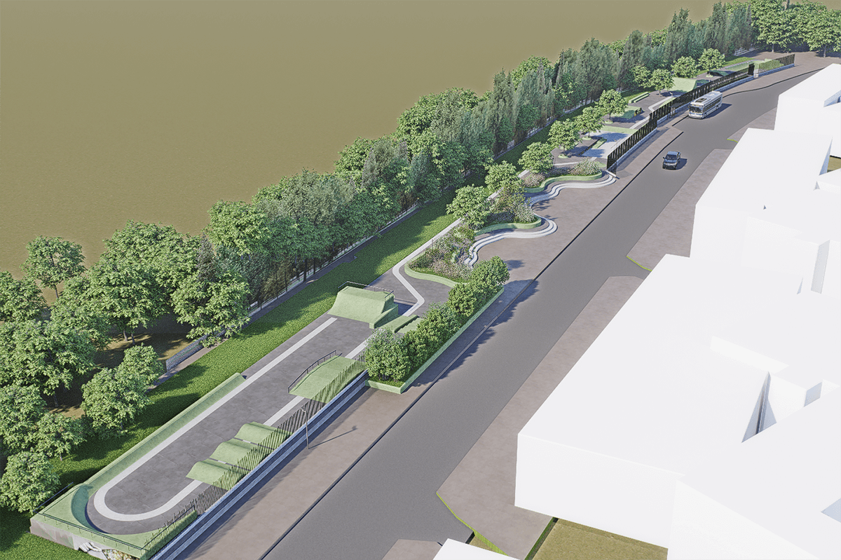 El diseño del Skatepark se organiza a lo largo de un recorrido longitudinal, culminando en tres sectores clave. En los extremos, se colocan bowls de práctica, mientras que a mitad de trayecto, se ubica una gran área paisajística que sirve como punto de encuentro y acceso al parque. Este diseño asegura una experiencia continua y dinámica para los usuarios, que podrán disfrutar de un recorrido diverso y estimulante.